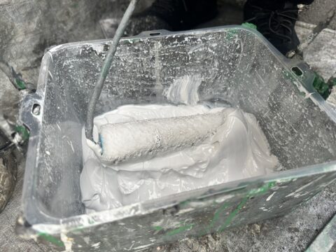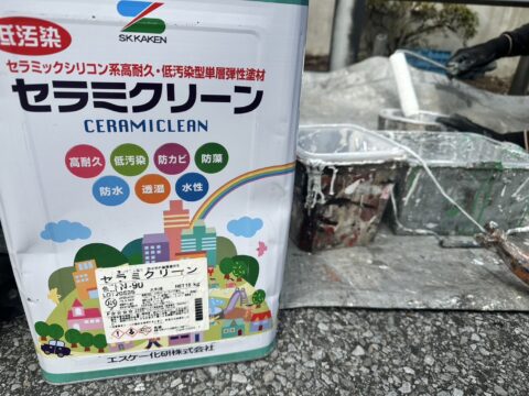 単層弾性塗材セラミクリーンを使用してマスチック塗装をしていきます。