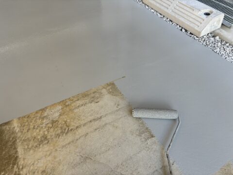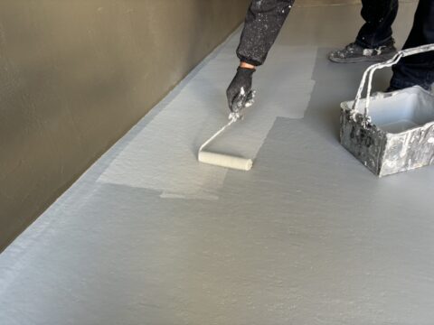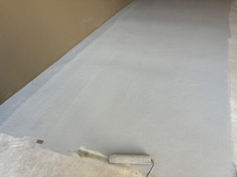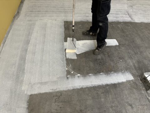 水系ポリマーセメントの防水材で臭気も少なく、お客様やテナントの方がいらっしゃる状況でも施工は問題ないかと思われます。