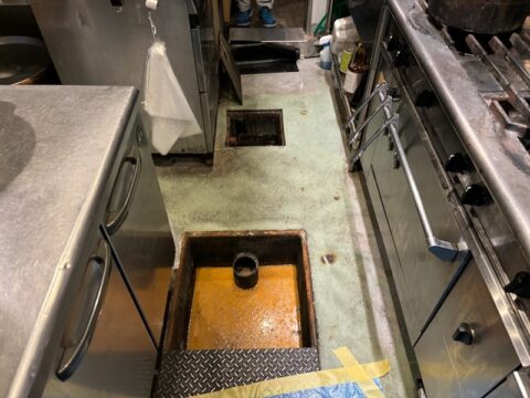 調査の結果厨房にある排水桝からの水がエレベーターピットに流れ込んでいることが確認できました。