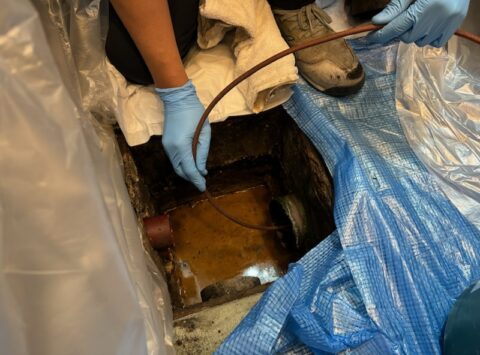 【東京都中央区 エレベーターピットへの漏水】エレベーターピットに水が溜まってしまった原因は厨房の排水桝の亀裂から!?
