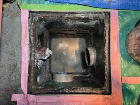 本来枡自体を解体して新しく作り直さなければ根本的に改善しませんが、店舗テナント様がまだ営業を行う状況ですので、今回は簡易的に修繕を行い後日大規模な修繕を行うような流れになりました。