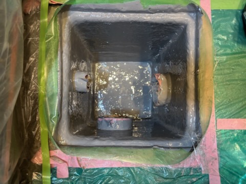 亀裂を止水材で埋め下地を形成後、FRP防水で枡を防水します。