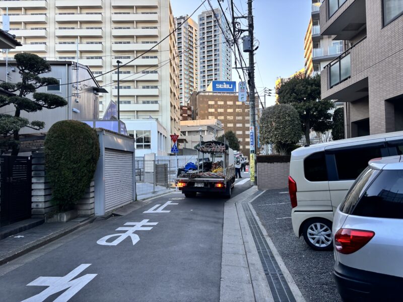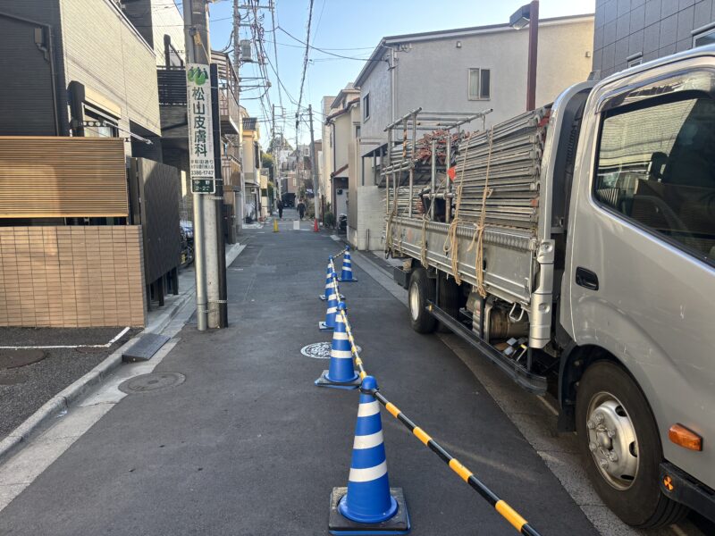 今回の現場は、建物に面している道路幅が狭く、敷地内に作業車両を駐車できるスペースもない状況です。