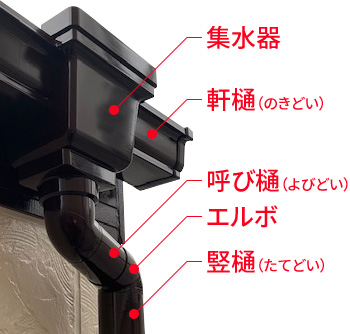 屋根から落ちてきた雨水を受け止める「軒樋(のきどい)」、軒樋から集まった雨水を排水溝まで運ぶ筒状の「竪樋(たてどい)」、それぞれの方向から流れてきた水を 受け止める「集水器」や雨樋同士を繋ぐ「継ぎ手(つぎて)」などのパーツがあります。