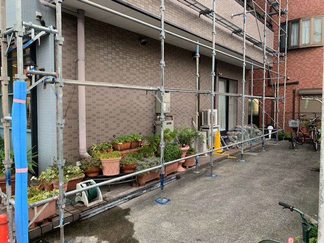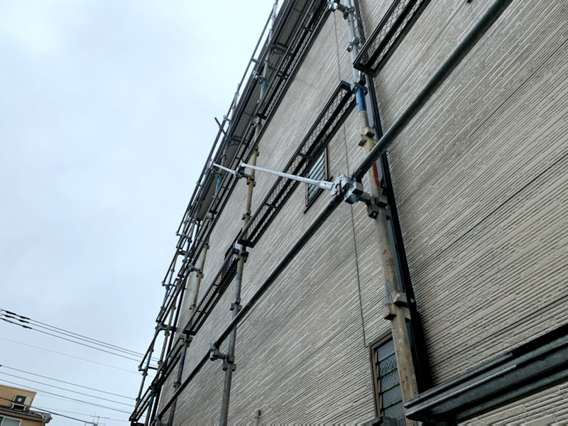 外壁塗装や雨漏り補修工事をする際には『足場の架設』が必要になります。足場の架設には足場を組むスペースが必要になりますが、近隣住宅とのスペースが十分にとることができないという現状のお客様がたくさんいらっしゃいます。お客様建物の敷地内のスペースが少ない場所での足場設置の際には次の方法で足場を設置します。