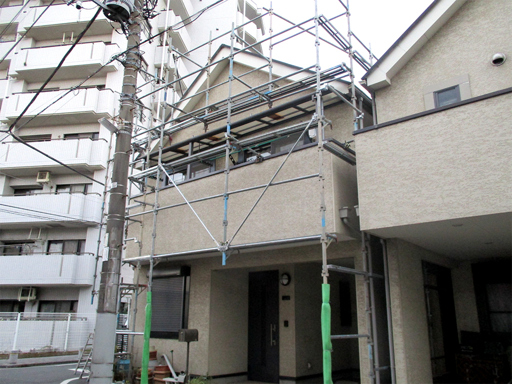センター踏板や単管足場などの幅の狭い足場部材を使用することで、お客様の敷地内への架設が可能です。