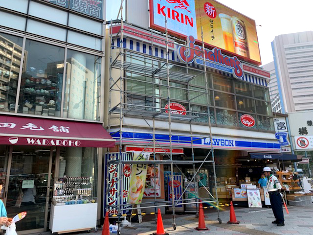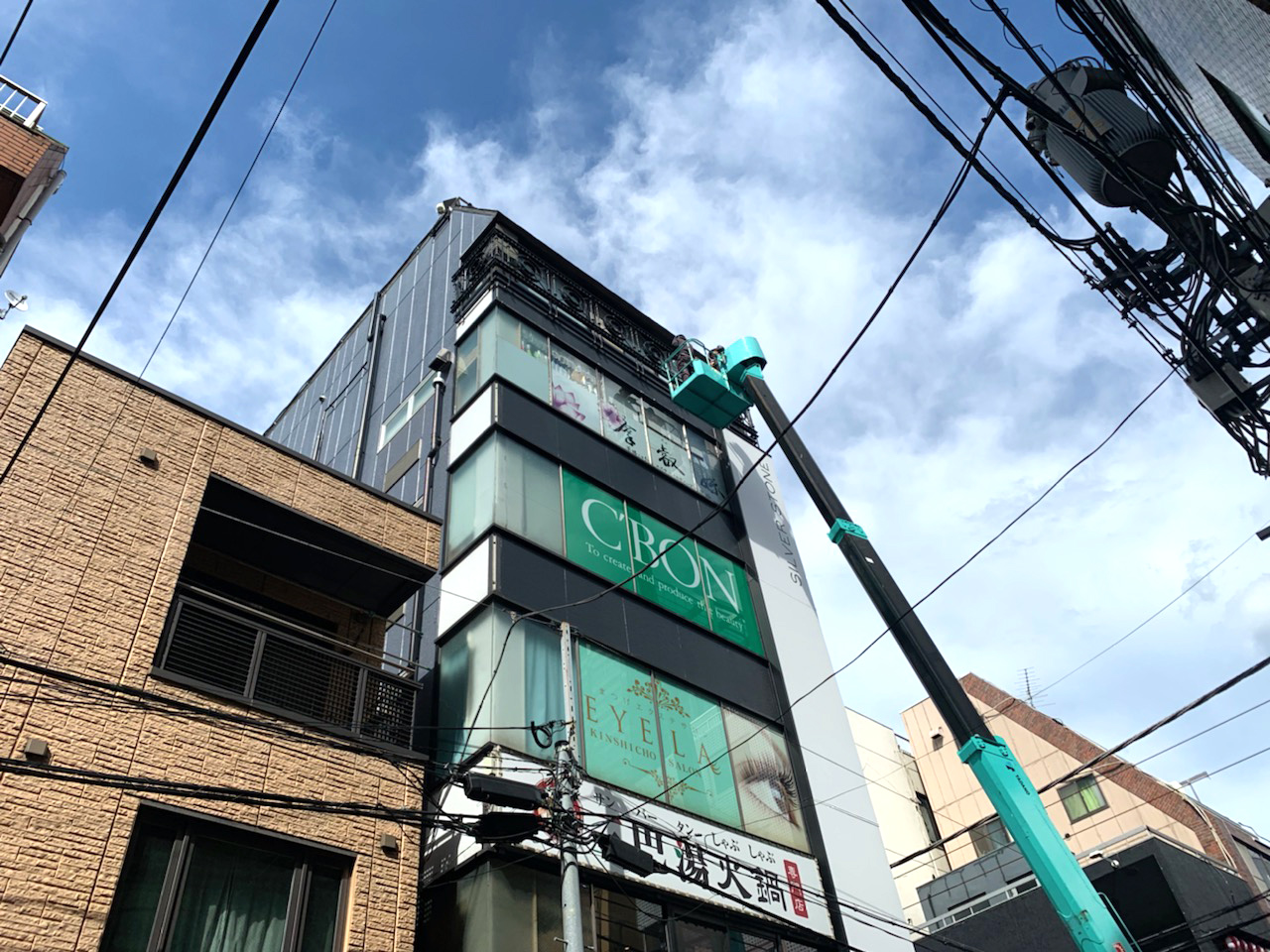 繁華街や店舗の条件により架設足場を設置しての工事が難しい場合は高所作業車を使用したりローリングタワー(移動式足場)を使用し工事を致します。日中の作業が難しい場合は夜間の作業で対応することも可能です。ピンポイントでの工事の場合には高所作業車を使用した方が施工をしやすい場合があります。