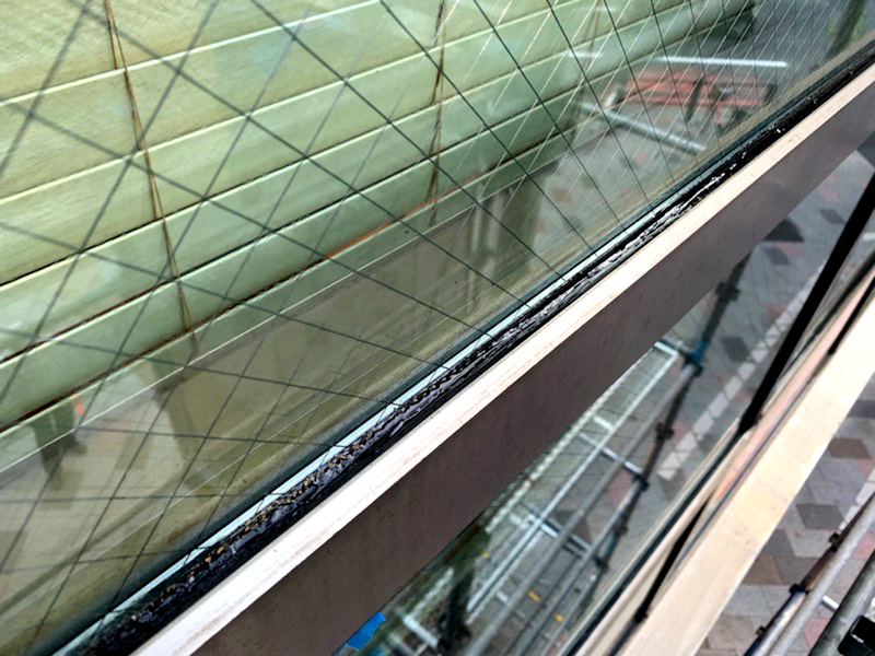 - 5階部分のサッシガラス廻りのみをシーリングしたいお客様でしたが、架設費用がかなりの負担になっており施工をお悩みでしたが、高所作業車を使用することでコストを最小限に抑え、雨漏り原因であるサッシガラス廻りのシーリングを施行することができました。